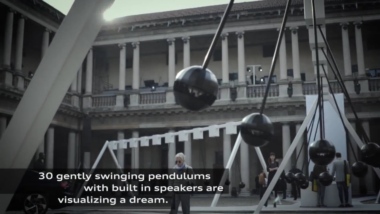 “Sonic Pendulum” is a sound installation based on the concept of having arti-ficial intelligence imagine and materialise an endless soundscape. Its struc‑ ture is composed of 30 pendulums that modulate the sound gently emanating from the speakers through a Doppler effect. An algorithm that continuously generates a calming and ambient-like bassline also processes and integrates the sounds and disturbances around the space generated by the installation visitors. The result is an ever-evolving piece of art that is constantly changing. Located inside a historic former seminary in Milan, Italy, this temporary installation at the Milan Design Week 2017 showcased the “soul” of the Audi A5 family.