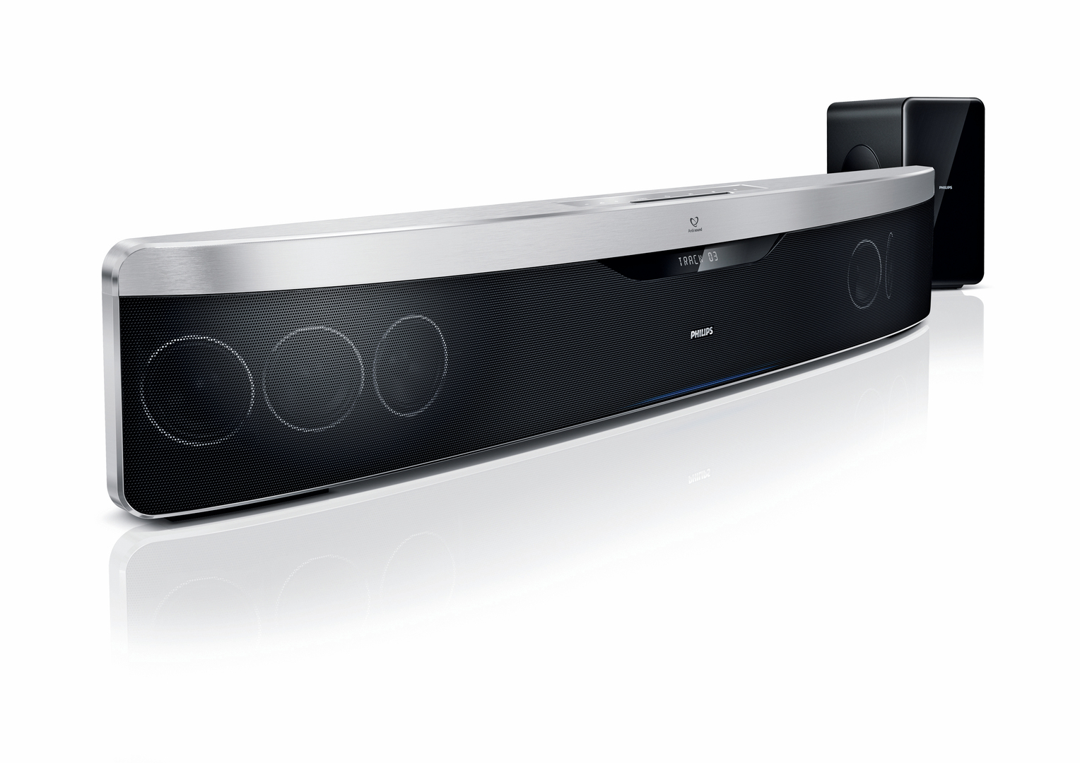 The Soundbar HTS9410 provides surround sound and cinematic quality pictures without speakers and associated cables having to be placed all over the room. With its high-gloss chrome and aluminium finishes, this slim and flat unit enriches the living room interior. Its controls are housed on top so as to not distract the user from the images on screen. The display shows only the information needed at any given moment. And the device’s curved form optimises the virtual surround sound of the angled speakers.