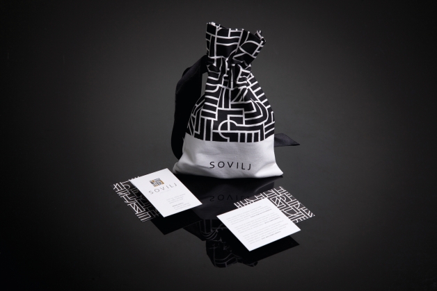 The visual identity of the jewellery manufacturer Sovilj Joaillerie is inspired by the timeless style of Art Deco. The graphic pattern of filigree lines and rich black-and-white contrasts appears elegant and mysterious. Particularly convincing is its successful integration into a glossy fabric. Textile jewellery bags as well as advertising materials form a unified, eye-catching and recognisable system. The elegant logotype and the reduced typography harmoniously counterbalance the distinctive graphic pattern.