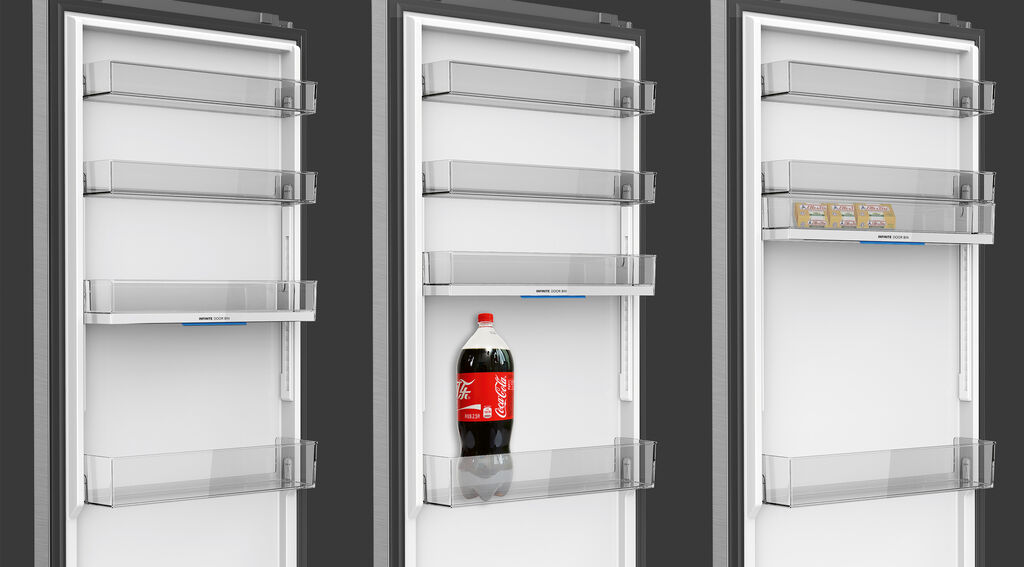 The SPACE MASTER Series refrigerator and freezer is a large-capacity model for the European market that addresses the growing need for storage space. A control panel with punched elements ensures a reduced, seamless front design. Sensor-supported LEDs integrated into the handle strip glow blue when approached and change to white when the door is opened. Inside, variable door compartments and shelves allow for flexible storage. A zone with adjustable temperature and humidity is a practical feature.
