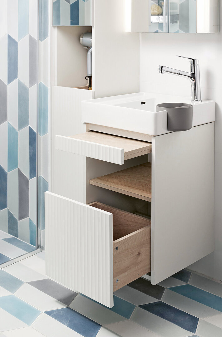 Spacity is an intelligently designed solution for small bathrooms. The washbasin features a pull-out shelf, an open compartment, and a spacious drawer. A special drain construction allows for wall-close installation, in order to optimally utilise the available space; at the same time, the tap area has been minimised. The vertical wave pattern of the fronts visually emphasises the slim construction of the vanity unit and creates a harmonious overall appearance.