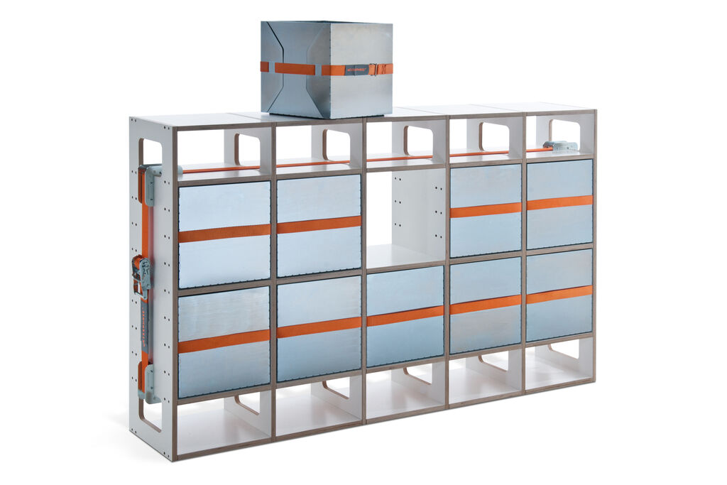 Emphasising its construction principles, the Spannkraft shelving system conveys an independent aesthetic tenor. All its functional components, such as the lashing strap, corner angles and connecting pins, are visible. The shelf can be transported as a kit, thus saving space, and be assembled at its destination without any tools in just a few minutes. Spannkraft is available in four heights and expandable in width. The optional drawers are also designed as a kit. They are folded by hand from a sheet metal blank, fixed with a strap and can be placed in the shelves where desired.