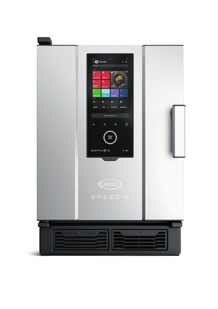 The SPEED-X is a powerful combi oven that impresses with its innovative functionality. In addition to an optimised cooking process, the appliance also meets the high demands of the catering trade to a particular degree thanks to its integrated digital functions. The elaborate formal design also impresses with its clear structure and the use of high-quality materials.