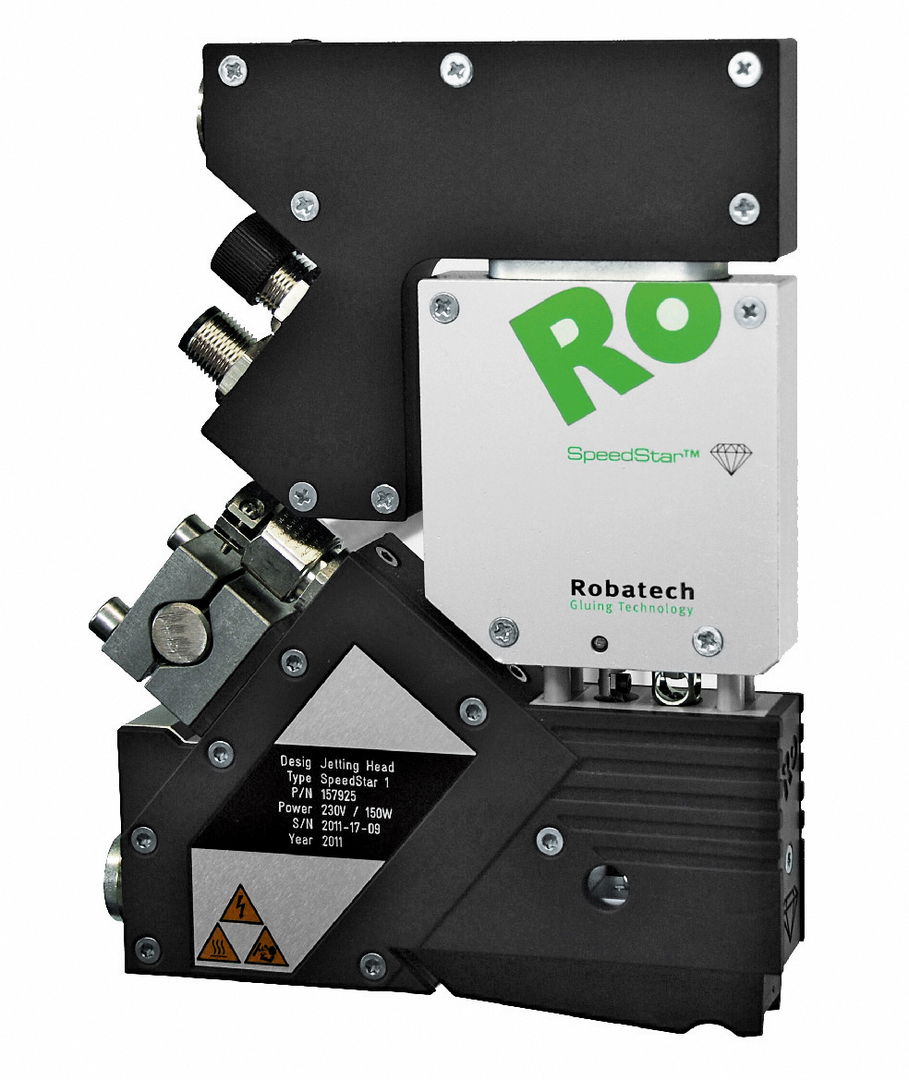 The new electromechanically driven SpeedStar applicator head sets new benchmarks in terms of speed, durability, application temperature and dimensions. Short switching cycles allow small and precise dots of adhesive to be applied in fast processes. Despite temperatures of up to 185 degrees centigrade and high viscosity levels, the applicator head possesses an extended life cycle. The sealing concept, featuring a combination of electronic stroke monitoring and cycle evaluation, offers circuit times of more than 250 million cycles.