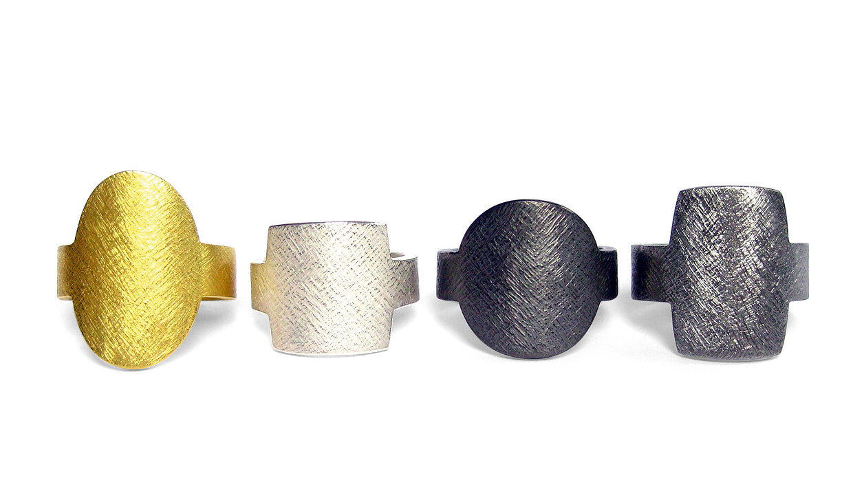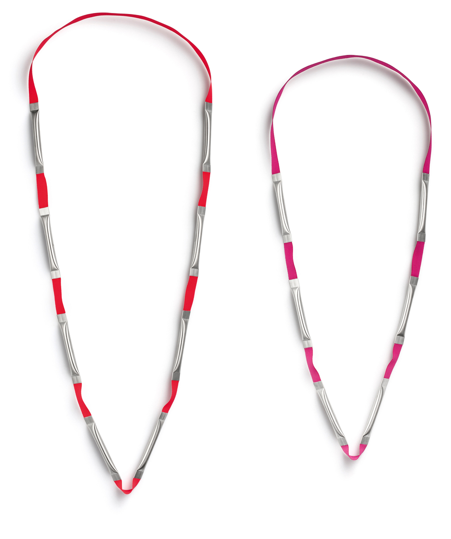 The shape of this necklace was inspired by a simple candy cone. The plasticity of the matt, gleaming segments made of stainless steel is accentuated by a flat, corded ribbon. This acts as the connecting element for the luxurious hand-made necklace, which is available in different lengths as well as in a very varied range of colours.