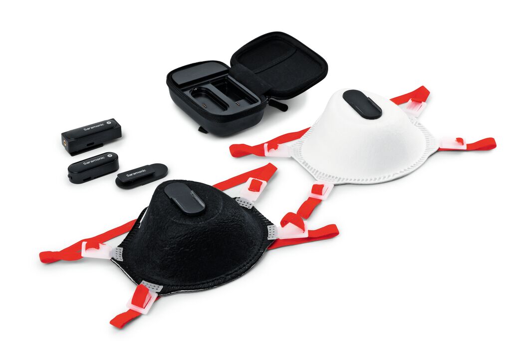 A useful accessory in the context of a pandemic, the SR-KM3 combines a wireless microphone with an FFP3 mask. The microphone is simply clipped onto the mask, which provides very good protection against viruses and is changed regularly, thus increasing the level of protection and allowing the user to work conveniently. The included zip bag with charging function serves two purposes: storing the wireless microphone and charging it.