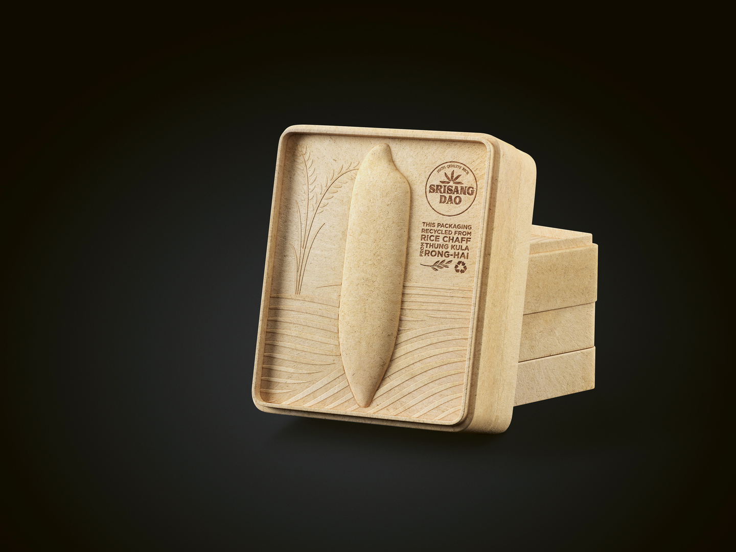 This organically produced rice draws attention to itself through packaging that specifically focuses on recycling. The die-formed carton is made from chaff, a natural by-product in rice production. The embossed shape, which looks like a grain of rice, the graphic lines and burnt-on labelling have both a visual and a tactile appeal for customers. With a mixture of rustic and refined elements, the earth-coloured box underlines the value of the local product. A small rice sack inside features matching printed lettering. Once the sack is empty, the package can be reused as a tissue box.