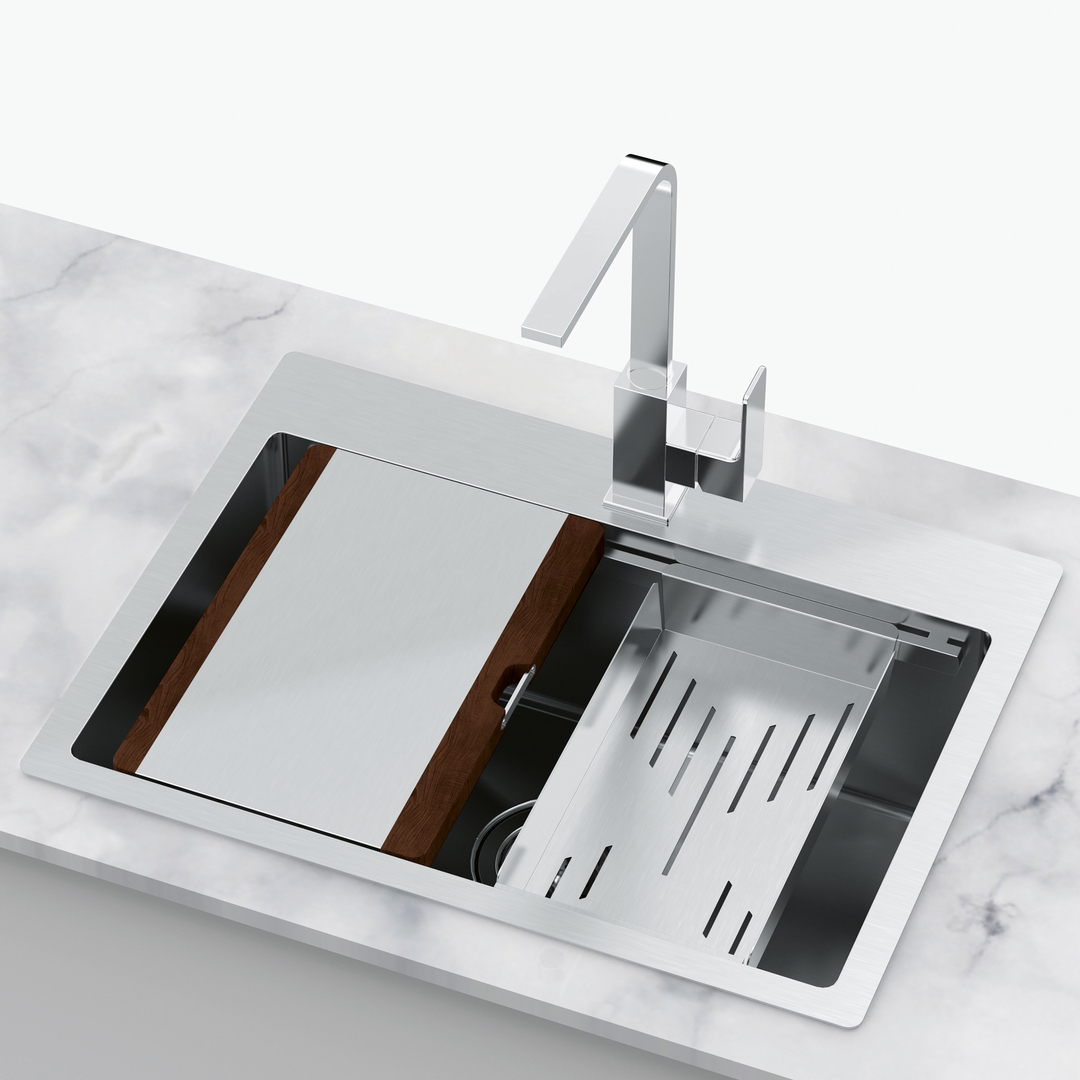 Thanks to a well-considered and space-saving design solution, this kitchen sink can easily transform into a flexible and multifunctional kitchen worktop.