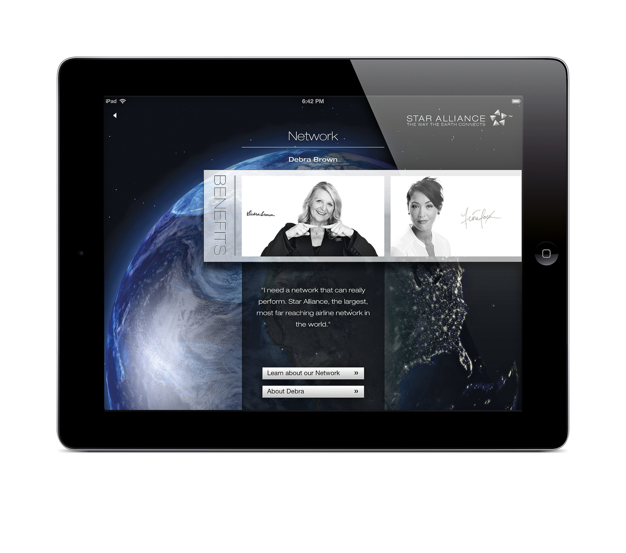This iPad app is an interactive portal for customers of airlines that are part of the Star Alliance network. Its distinguishing feature is a 3D globe, which visualises the route network of Star Alliance’s 27 airlines, enabling voyagers to keep track of their travels. Depending on the traveller’s time and place, additional information is displayed, including weather data, details on the destination airport and up-to-date information about flights.