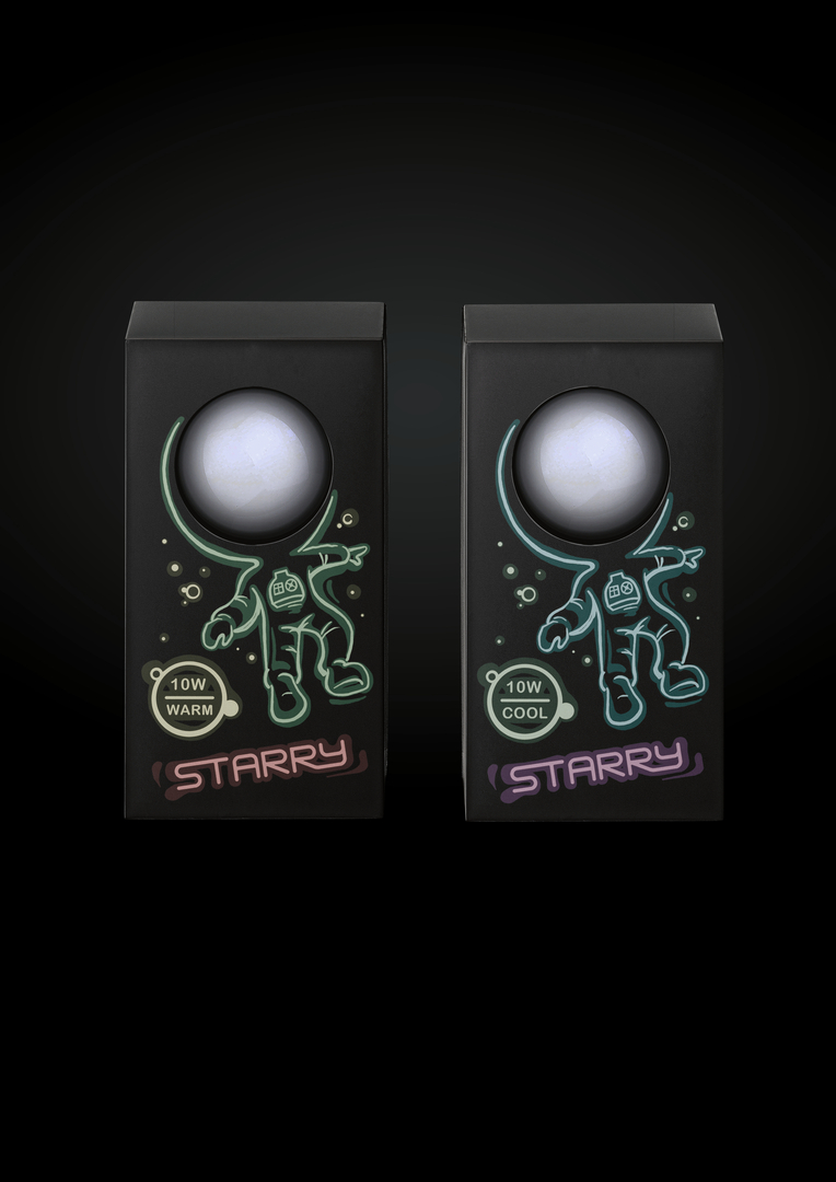 The product name STARRY makes it clear that this LED light bulb wants to light up the earth at night like a star. Their packaging shows an illustration of an astronaut. In the head area it has a recess so that the bulb exposed here is reminiscent of a helmet. Its white hue contrasts sharply with the box, which is designed in deep black with some bright colour effects. The different wattages of the light bulbs are represented by various illustrations of astronauts. Two indications in different colours also refer to warm or cold light.