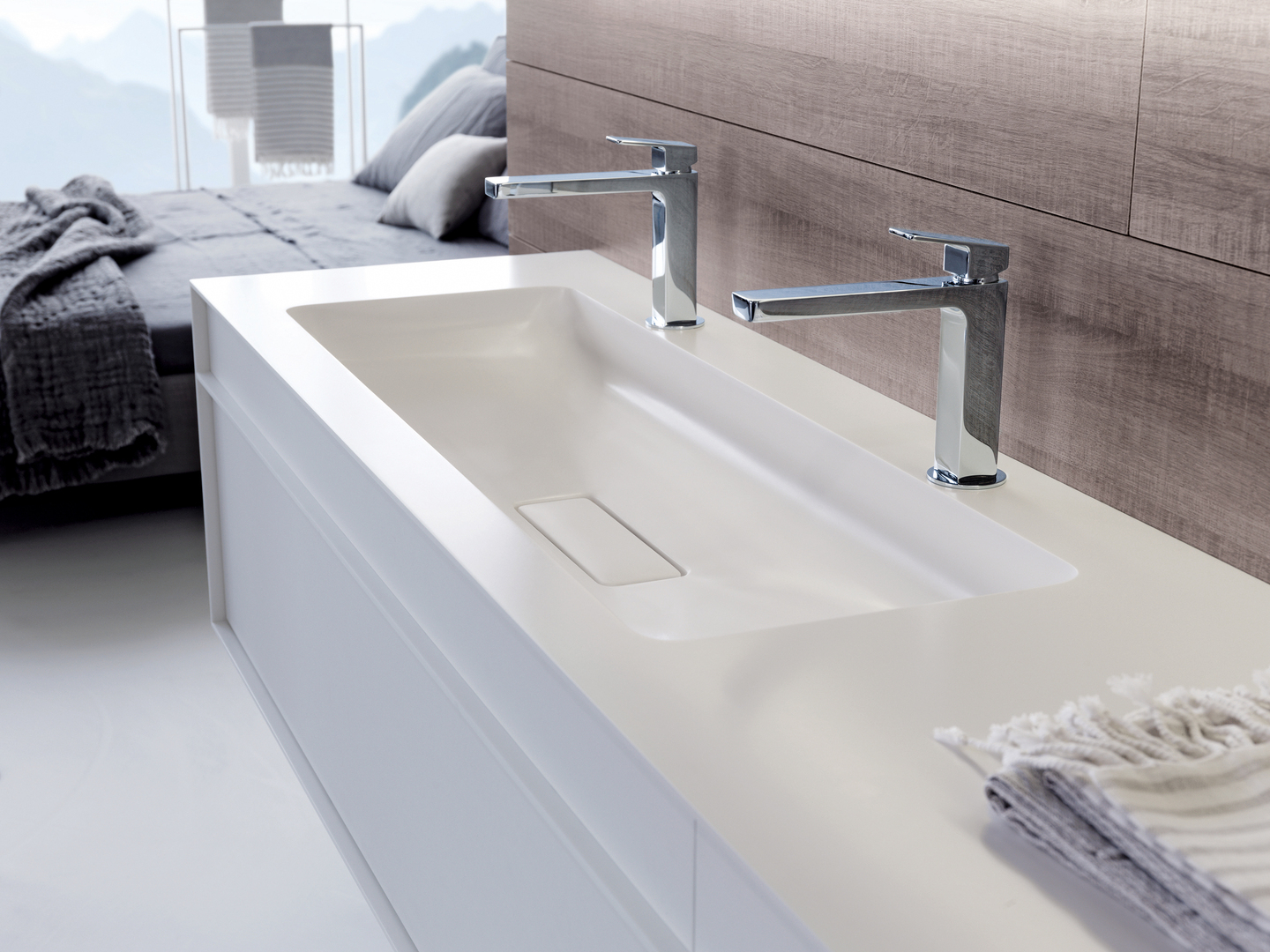 The State bathroom cabinet stands out because of the fine, precise lines of its front edge. It is manufactured from the high-quality material Corian in an innovative process that results in a seamless piece of furniture termed a Unibody. The new technology used in the drawer, combined with a space-saving siphon, allows for an optimal use of space. The matching wall mirror is equipped with harmonised LED lighting. State can be manufactured to fit precise dimensions down to the last millimetre. It can be customised to produce the required surface effects and colour combinations.