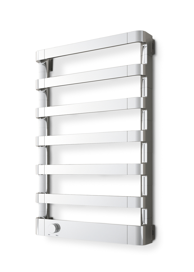 This radiator derives its independent aesthetics from an innovative combination of collector and horizontal flattened tubes. The “Push & Round” system controls the temperature electronically. Coloured LEDs assist in regulating the heater so that it can be comfortably and intuitively operated. The radiator is available with the four exclusive surfaces chrome, chrome matt, chrome black and metallic pearl white, as well as in three different heights.