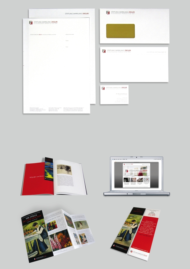 For a German art foundation with a top-class collection, a new and distinct visual identity was created. The objective was, in addition to designing a logo and corporate stationery, to develop consistent branding for the relaunch exhibition, including exhibition design, banners, posters and a website. An unobtrusive typographical approach – the negative intersection of two colour planes forming the “Ziegler-Z” – was intentionally selected so as to pay tribute to the foundation’s tradition and history, and also to direct focus towards the artwork itself.
