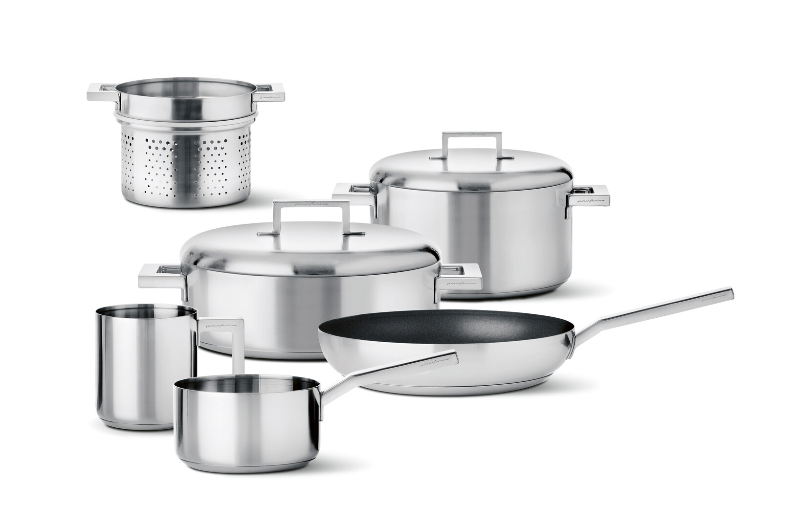 This cookware collection is marked by geometric shapes of a timeless appearance, skilfully geared towards user demands in terms of form, ergonomics and function. Alongside a coated frying pan, the collection comprises four differently sized stainless steel pots. The contrast between the shiny finish of the handles and the satin-finished exterior of the pots is particularly appealing. The lids showcase strongly rounded lines and merge with the pots to form a visual unity.