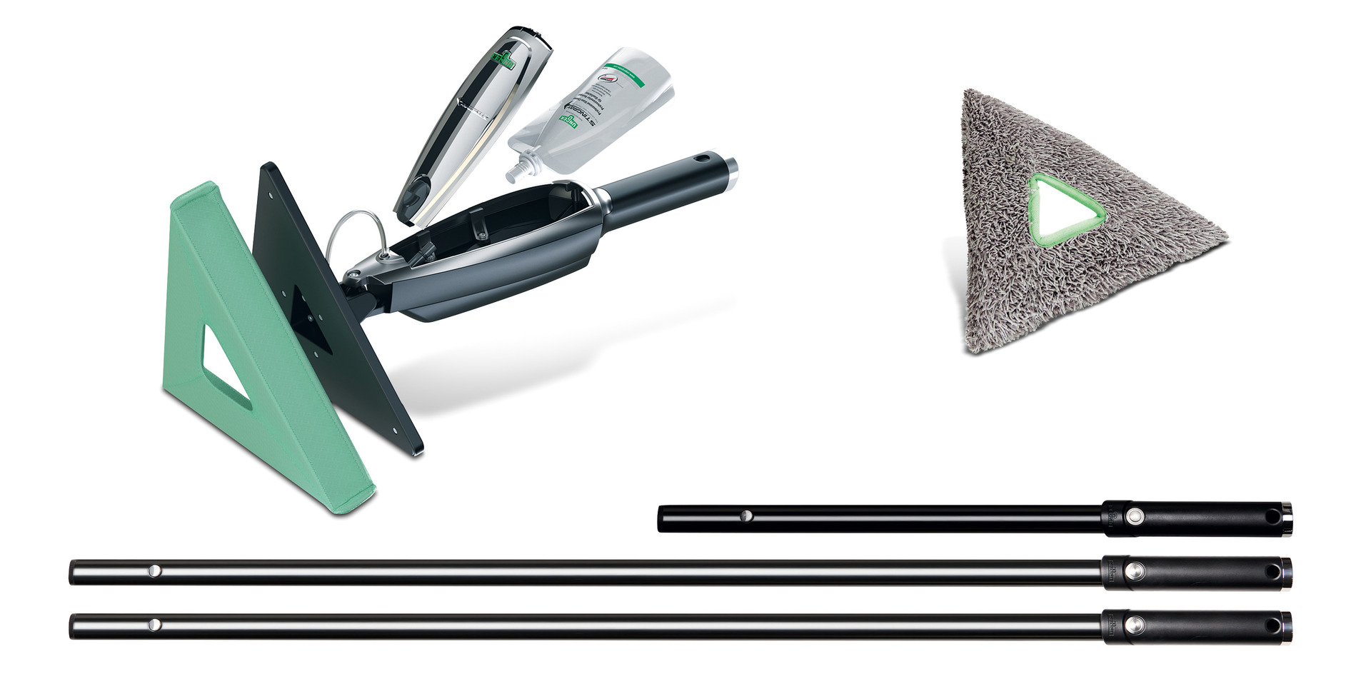 The Stingray indoor cleaning tool simplifies the professional cleaning of windows from the inside. The ergonomically designed Easy-Click-Pole can be extended up to a length of four metres. In combination with the cleaning pad, hard-to-reach areas also become easy to clean. The innovative pad has a triangular form, and windows and frames are cleaned simultaneously. The integrated spray system enables spraying and cleaning in one step, without any drips.