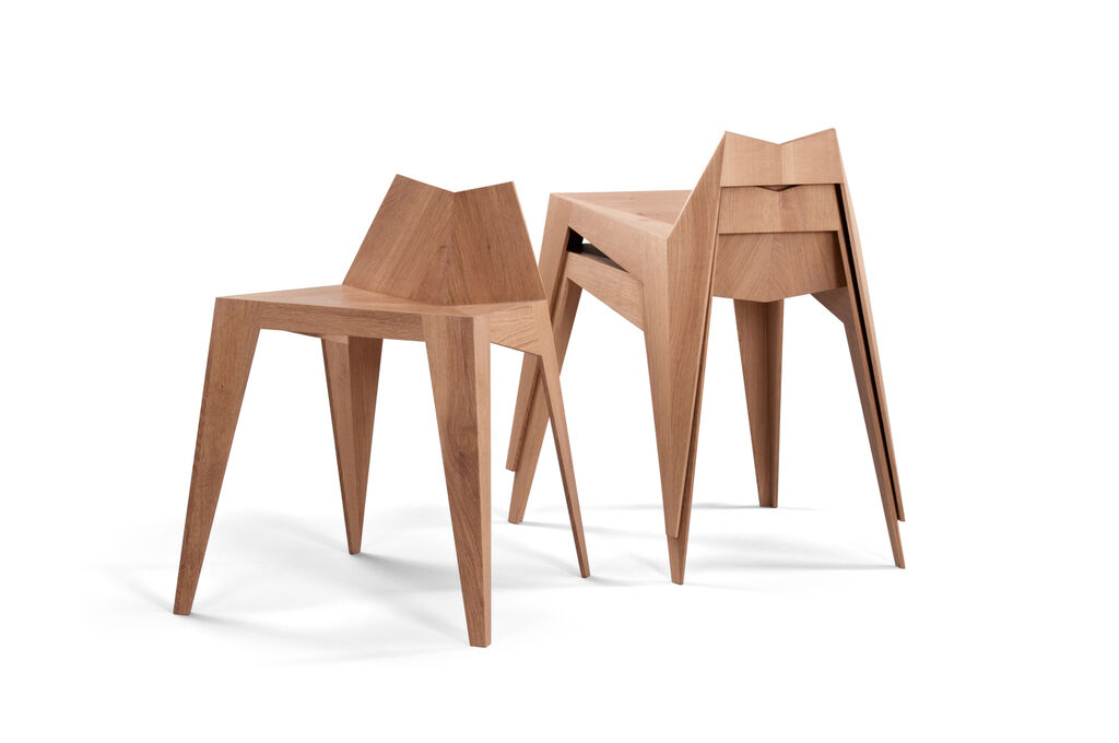 stocker looks like a fusion of a chair and a stool. The easily stackable wooden chair is suitable as furniture for private as well as semi-public spaces. Its design vocabulary highlights the beauty of local wood. Featuring the resource-conserving thickness of 8 mm, its complex architecture provides good stability and reduces the weight to 2.3 kg. The compact structure allows for space-saving storage.