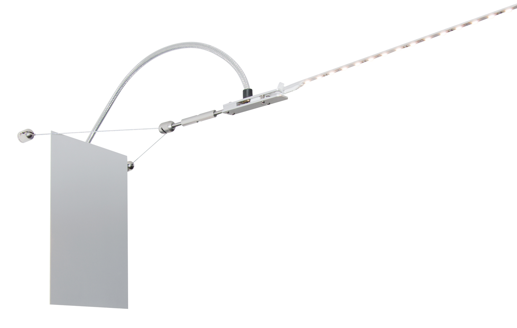 Strapled Advanced is an LED lighting system that looks like a light beam crossing the room. This effect is based on a transparent plastic composite band with attached linear LEDs. In order to appear like a light beam, the band needs to be strongly tightened, which requires mechanical fixtures. The transition from round to elongated shapes is achieved by reducing the radii and increasing the elements towards the band. A reduction of the thread’s visible part can be achieved by the tolerance of the two fixtures to each other. The electrical connection is integrated in a longitudinal direction between the fixtures.