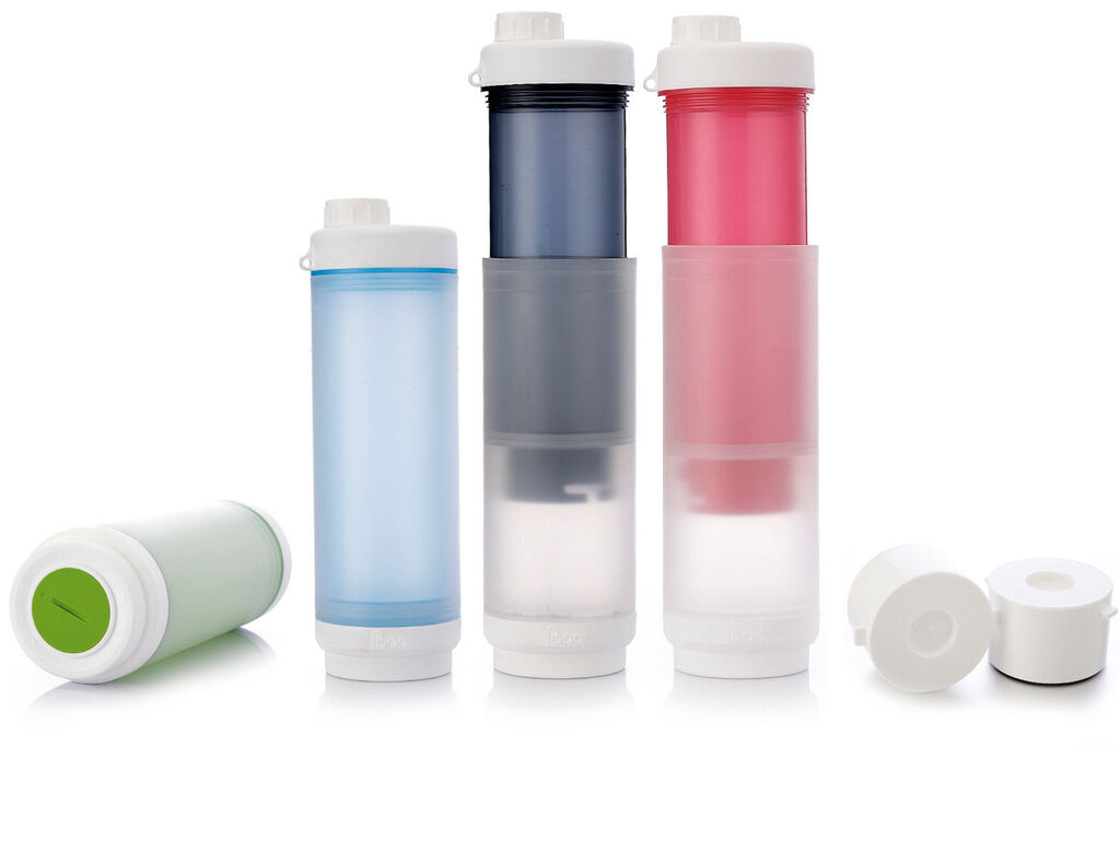 Sukori is a water bottle with integrated filter function. The filter is activated as required by means of a simple hand grip. In order to produce drinking water, the inner vessel with the filter at the bottom is pulled out and the water to be purified is filled into the main vessel. Thereafter, the element with the carbon filter is pushed through the water and thereby removes the chlorine, heavy metals, chemical substances and odours.