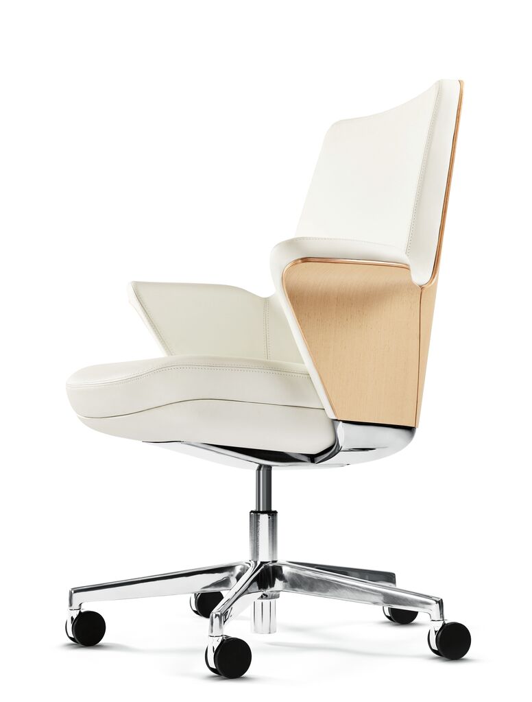 Summa is a luxurious-looking and versatile office swivel chair that integrates well into both conference rooms and home offices. With its cocooning shape, it conveys harmony, quality and comfort. Thanks to the use of a wide range of materials, the chair can be precision-adjusted to the respective environment. With physical health and protection of the environment in mind, the seat has been made using chromium-free leather. The backrest is available either in an elegant wood or upholstered version.