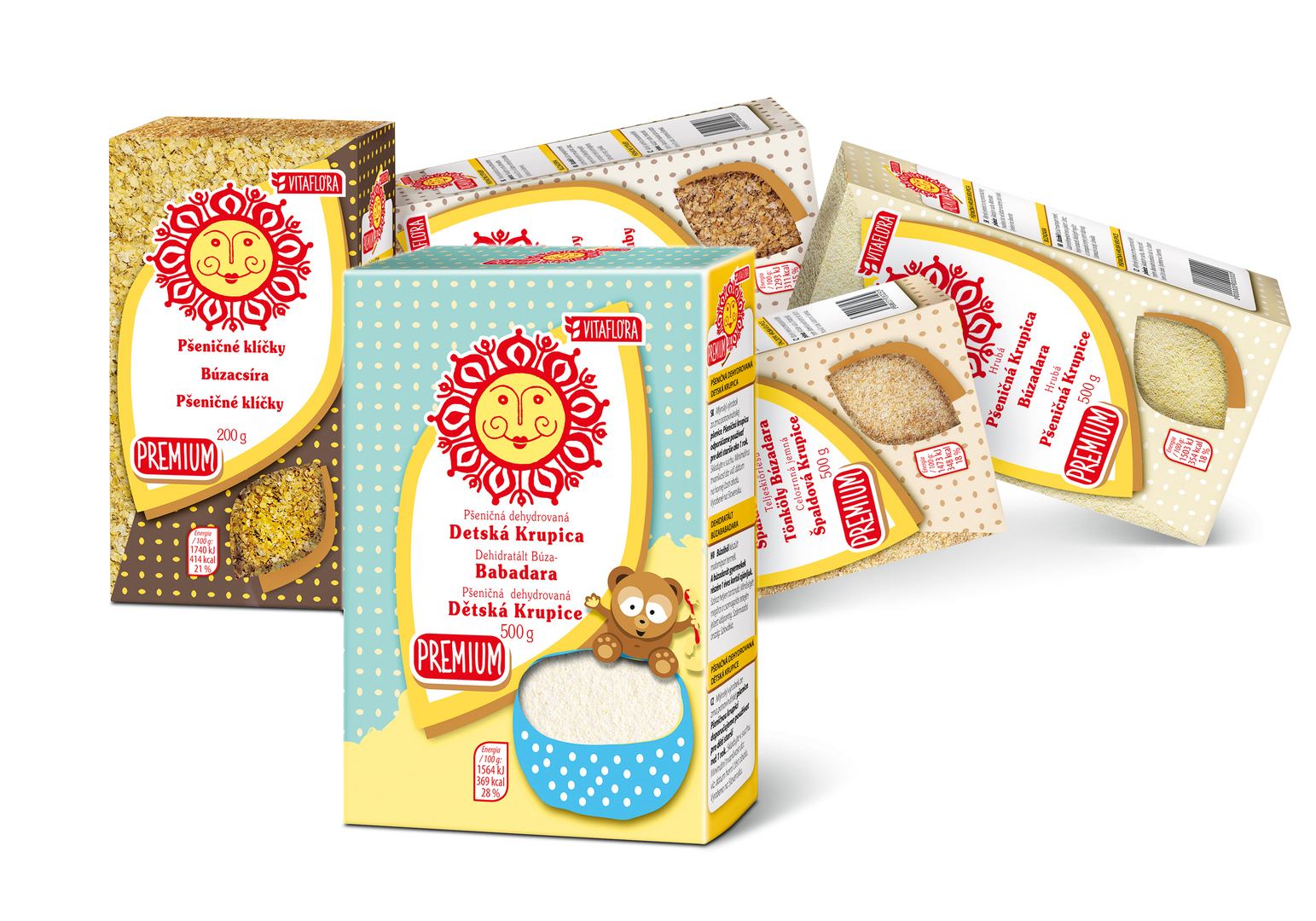With the sun as a symbol of life, this packaging design for a range of 27 cereal products conveys the message of “Keep smiling! Be happy!” It thus playfully aims to evoke positive emotions by giving the consumers a feeling of amicable optimism in everyday life. While the design element of grain symbolises the notions of new life, wealth and health, the grain-shaped label conveys all other information. Diverse structures and background colours in harmony with nature illustrate the range of flavours available.