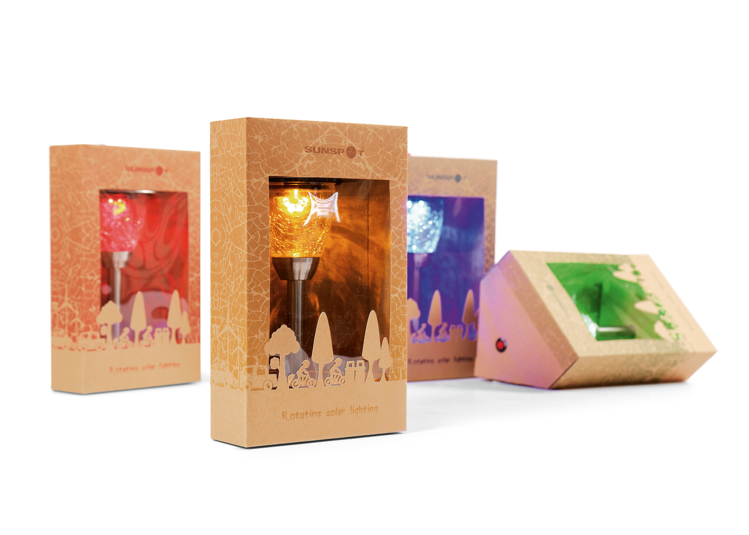 The Sunny Homey packaging conveys the clear message of having more fun locally with less carbon footprint. Designed for a rotating pathway solar light, the kraft paper packaging offers four different colours to demonstrate the four lighting shades. The design on the front of the package shows the silhouette of bikers riding across a park, echoing the longing for a simple yet mindful life. The house-shaped structure has emerged as a space-saving storage solution that is both durable and meaningful.