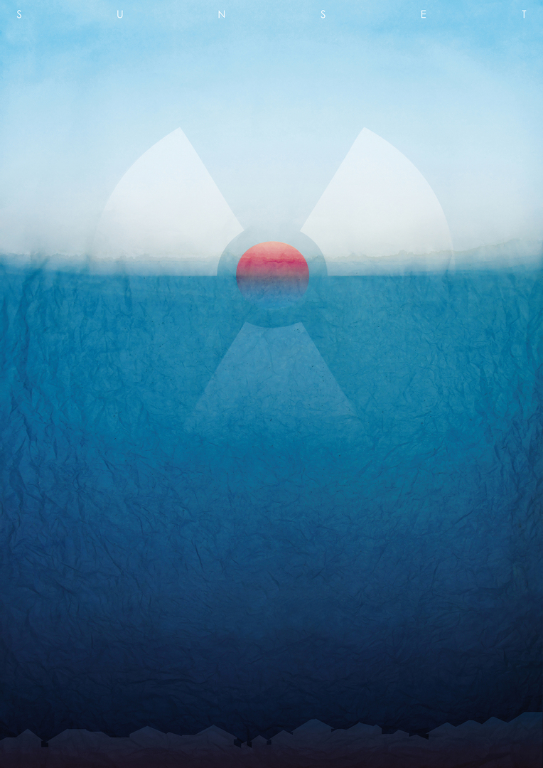 “Sunset” is a poster that draws attention to the far-reaching effects of the nuclear disaster of Fukushima. These effects do not only concern people who are directly affected by the incident. The poster is divided into two halves. The lower half looks like it has been submerged in water. This in part also applies to the red circle, the symbol of Japan, in the middle of the poster as well as the roofline of the Fukushima houses along the bottom. The design thus expresses that the disaster has spread.