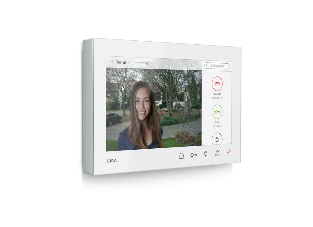 Safety and convenience are the hallmark of the puristic surface-mounted home station video 7. A high-resolution 7" TFT touch display shows who is at the door. The high picture quality of the glass display can be viewed from the sides. All practical functions and settings can easily be controlled via an intuitive operating concept based on icons. The unit can either be mounted on the wall or be placed on an item of furniture with the help of a stand, turning it into a visual eye-catcher.