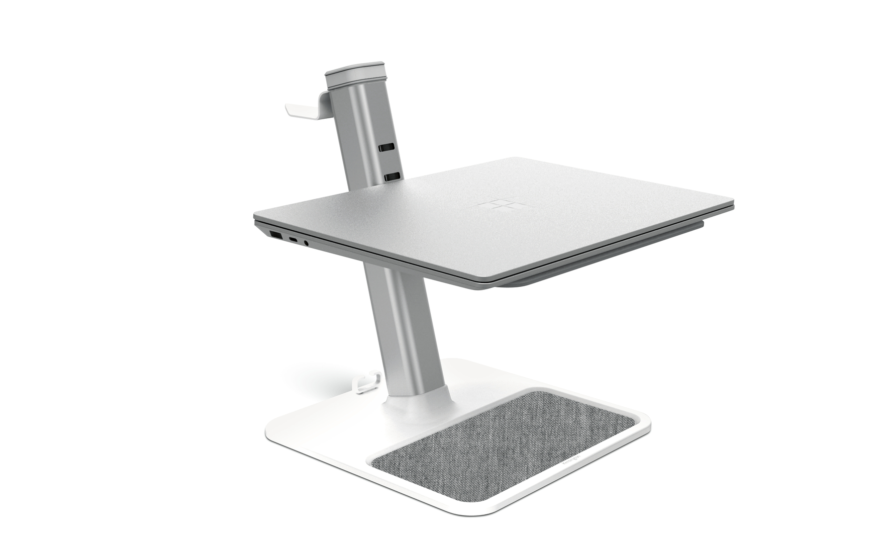 The Surface Laptop Riser has a height adjustment system that allows users to set the most ergonomic height for the Surface laptop. The laptop stand is constructed of aluminium alloy and steel, so it is stable and dissipates the heat emitted by the laptop well. Other features include a headset hanger and a cable loop. A docking station can also be placed in the fabric-covered recess in the stand to keep the workplace tidy.