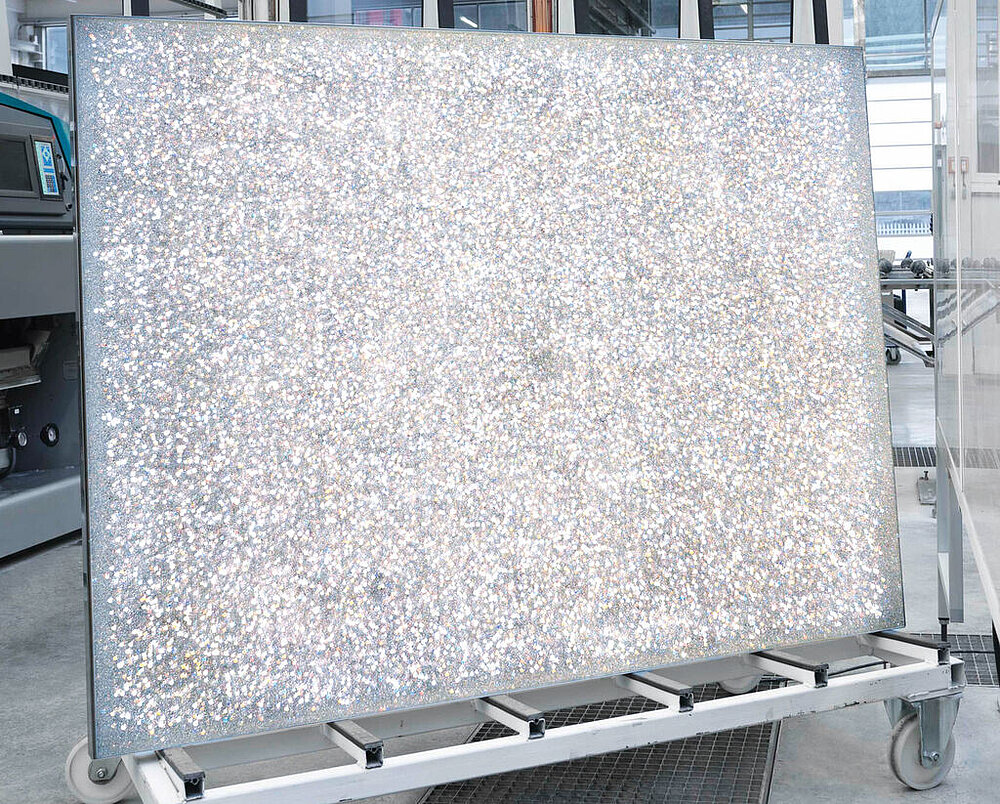 Precisely polished crystals make up the surface of this backlit glass panel. Thanks to an open structure these can also be clearly felt. Approximately 200,000 crystals are glued to every square metre of a glass substrate and are ultimately backlit using special LEDs. The boards are modular and can be combined freely, enabling the creation of a wide variety of colours and shapes. The corresponding Swarovski Active Panel casing is custom-made and can be individually fitted.