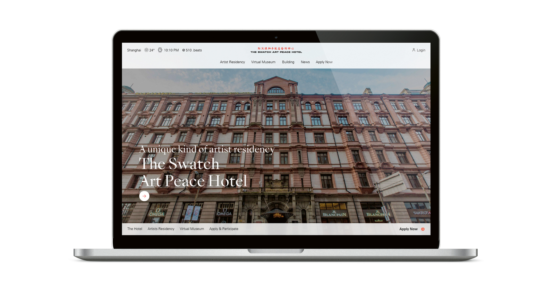 The Swatch Art Peace Hotel gives artists a chance to live and work in Shanghai, China, for a time. The related website was created as application platform where artists apply online. It also includes a virtual museum in which users can discover all the artists in residence, their artworks called “Traces” via an explorative navigation. Besides presenting the history and concept of the hotel, the website provides information about exhibitions and events. Its design is based on the typical straightforward Swiss look and feel, with fonts by Swiss typographers and the colour red ideally linking the brand to Switzerland and China.