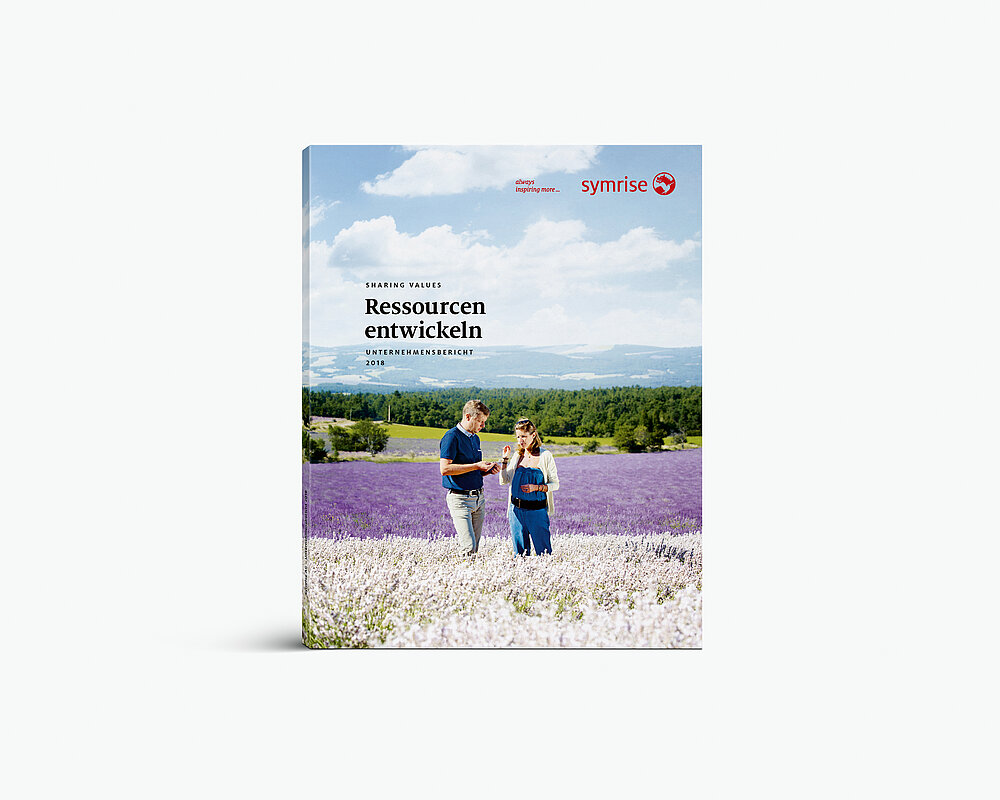 The sustainable handling of natural resources is one of the corporate objectives of Symrise, an international manufacturer of fragrances and flavourings. Entitled “Ressourcen entwickeln” (Developing resources), the 2018 annual report presents various development examples such as patchouli oil production in Indonesia or sustainable lavender-growing in Provence. A striking and colourful layout adds to the clear structure of the sections – from the magazine and the section on sustainability to the group management report including the consolidated financial statements, the content is presented in a visually attractive manner.
