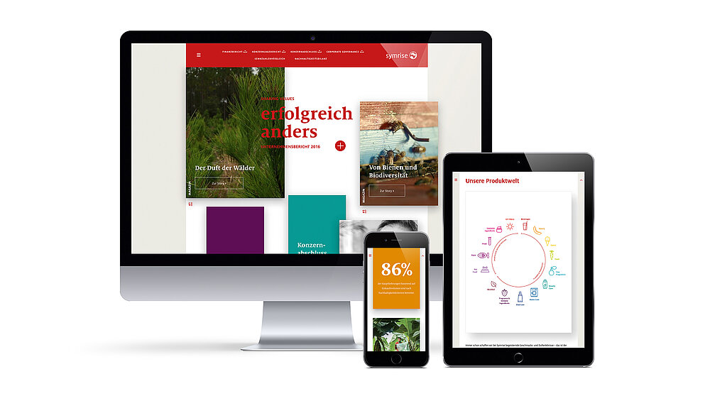 Deliberately following the design of the printed annual report, the 2016 online report of Symrise presents itself with large-format images combined with illustrations, powerful typography and striking colours. The magazine teasers, with their card-flip effect and moving images in the stories, make for a vivid reading experience. The responsive report with the title “Sharing Values – Diversifying Success. Successfully Diversifying” is available in German and English and provides further content supplementing the printed report, featuring, among other things, an interactive chart generator with all the key figures.