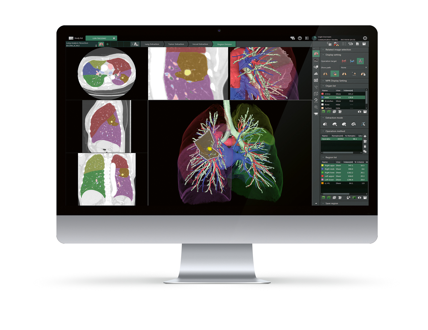 Synapse 3D is a software platform for advanced processing and analysis of medical imaging. Thanks to the sophisticated user interface, the application is intuitive to learn. After selecting the anatomical region, the workflow bar guides users through the necessary work steps. There are four special modules for detailed views of the heart, lung, brain vessels and liver. With only a few clicks, individual structures can be cropped and differentiated in colour. In addition, images can be shared using mobile devices.