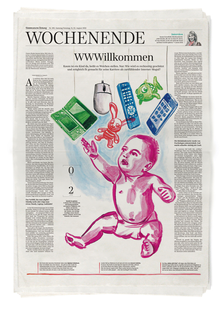 The headline “WWWillkommen” (WWWelcome) and the illustration of a baby that is surrounded by age-appropriate toys as well as electronic devices indicate the subject of this weekend supplement of the German newspaper Süddeutsche Zeitung. The focus is on children’s and teenagers’ relationship with the digital world. Questions such as why do bloggers write or when do teenagers notice that they are addicted to Facebook are explored alongside a look into the future and the question of what kind of adults today’s children will become.