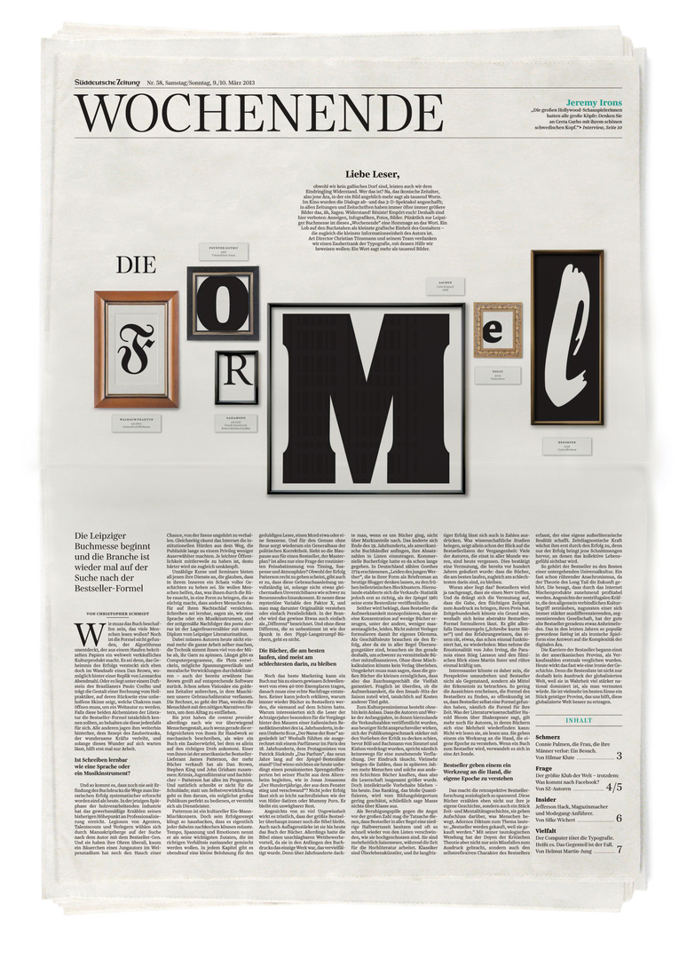 This weekend supplement of the German newspaper Süddeutsche Zeitung was created for the Leipzig Book Fair and pays homage to the word. The letter is honoured as the smallest graphical unit for the designer and as the smallest unit of information for the author. Following the motto “A word is worth a thousand pictures”, the cover of this supplement features, besides the text, only individual, framed letters in different fonts, reflecting the spectrum of the design options. There are neither infographics nor photographs on the cover.