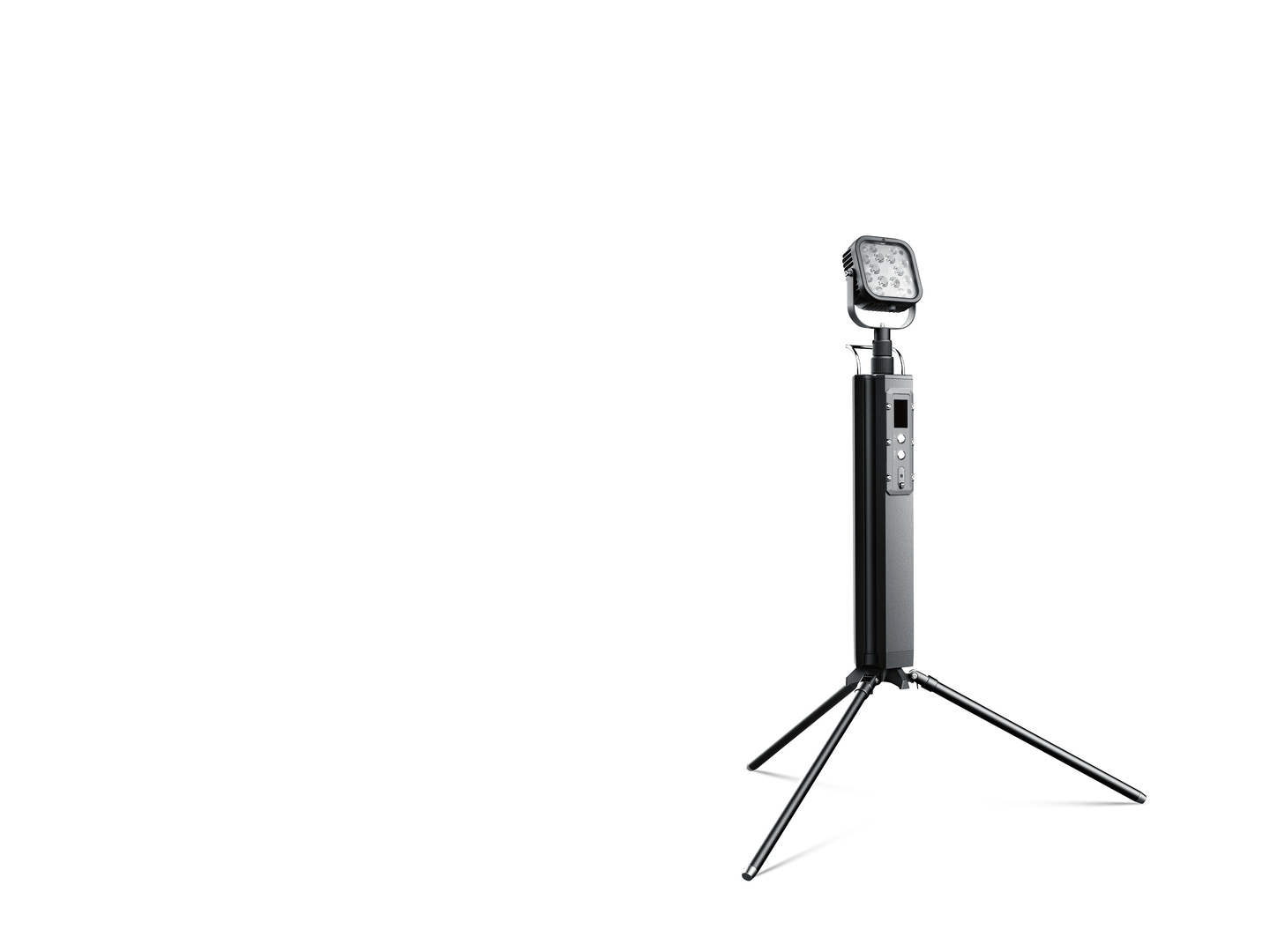 This working light was developed to provide reliable emergency lighting for railway rescue services. The powerful LED light source is packed into a compact structure which comes with floodlight, spotlight or signal-light settings on the back of the light. The foldable tripod with a maximum expansion height of two metres ensures the light can be positioned securely, even on rough terrain. The integrated battery provides rapid illumination without requiring an external power supply.