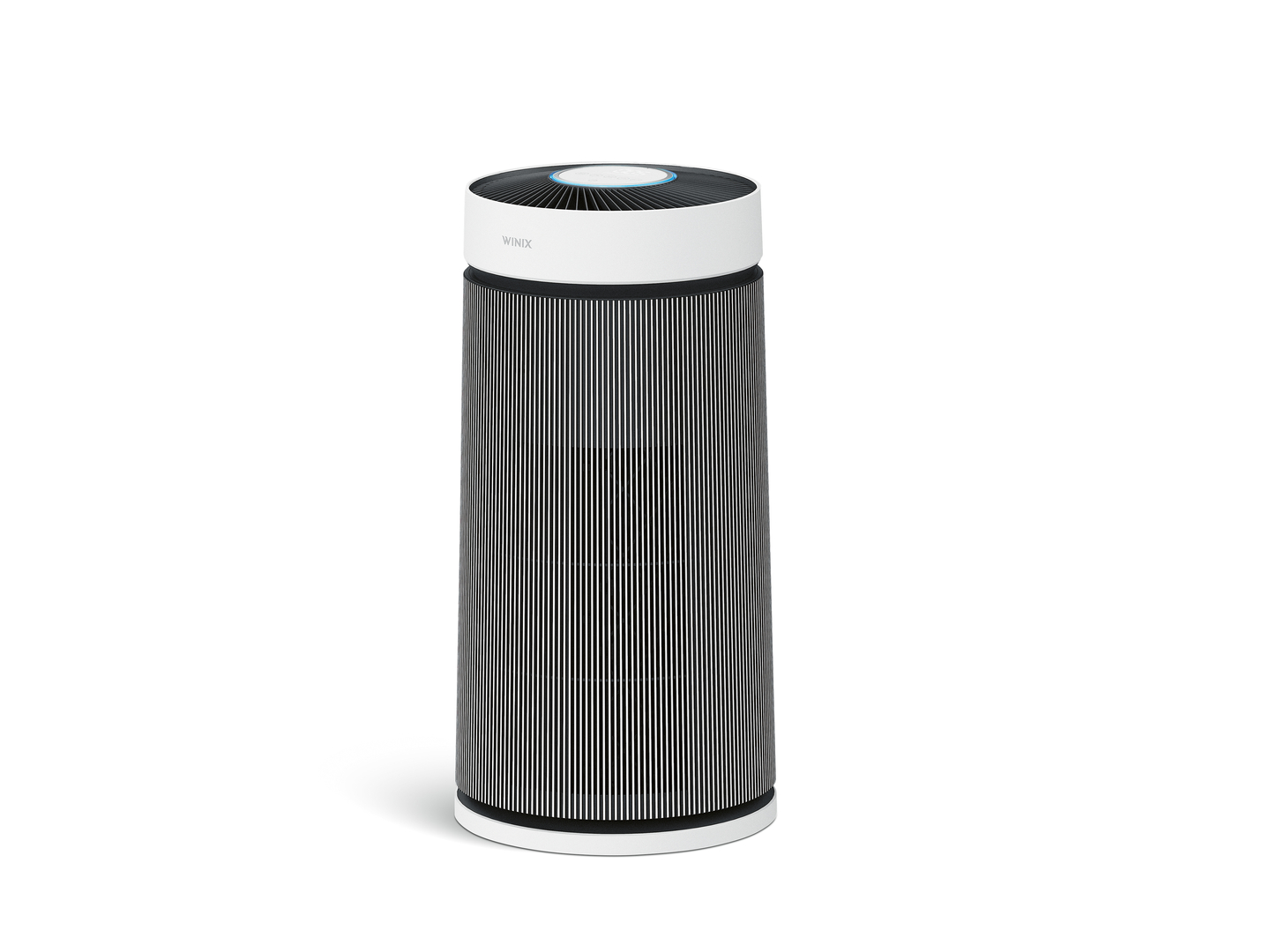 The T1000 is an air purifier with a cylindrical body. The horizontal, dark grooves and white surfaces create a contrast that will blend into most living and office spaces. With a 360-degree suction structure, the device generates good air circulation, so that rooms up to 128 square metres are supplied with better air quality. The air outlet is located on the top. An intuitive user interface and a handy handle for changing filters make it easy to use.