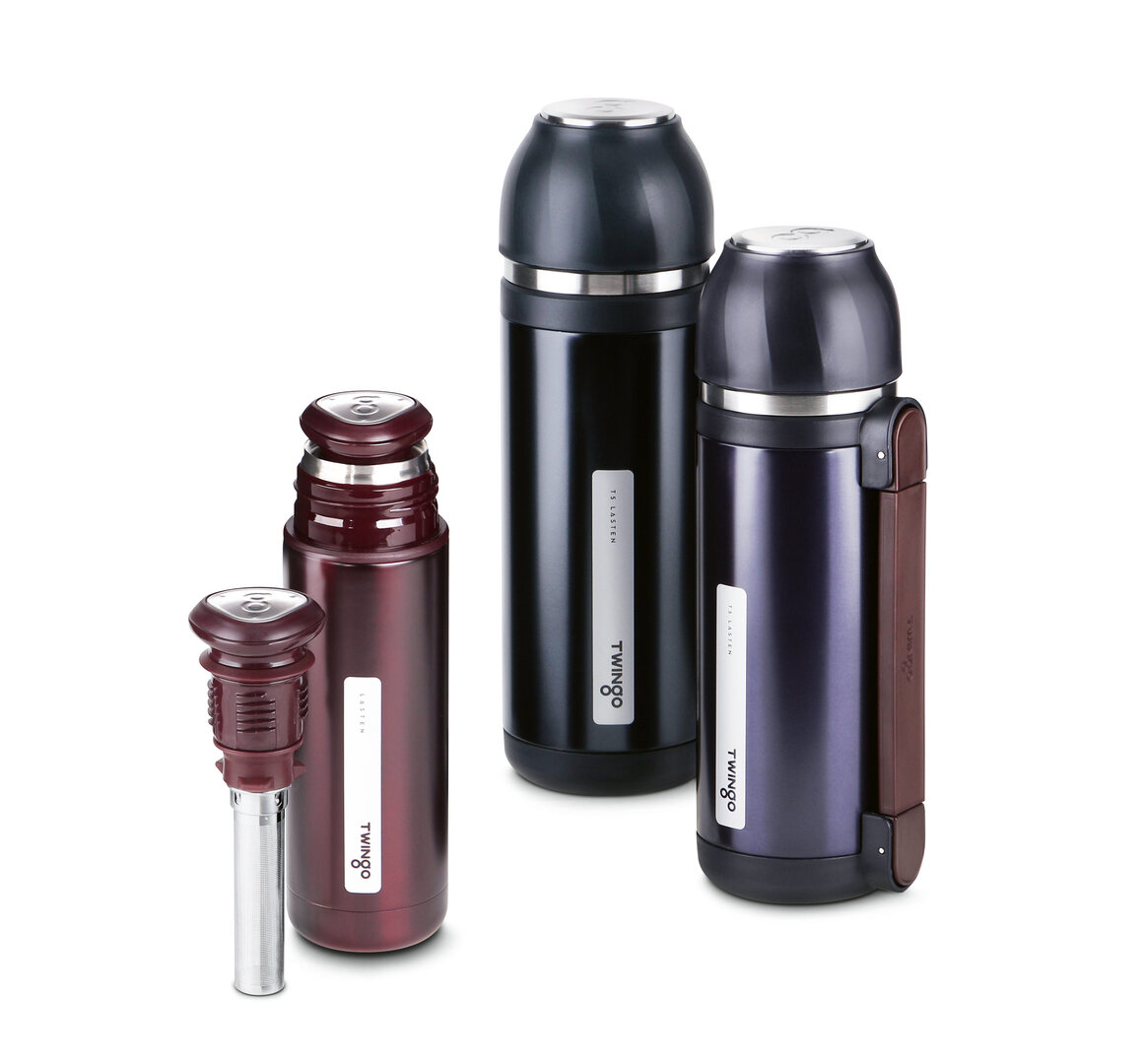 This stainless steel vacuum bottle showcases an innovative mechanism which allows flexible pouring in all directions: silicone protrusions at the bottom of the inner stopper ensure an even water flow. The stainless steel lid is coated with polypropylene on the outside, preventing it from heating up. The lid can also be used as a cup and feels pleasantly smooth on the lips when drinking. In addition, tea drinkers have the option of attaching a tea strainer to the bottom of the inner stopper.