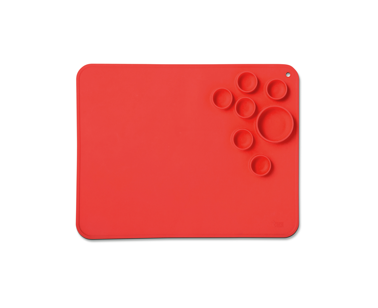 This silicone handiwork mat helps to improve organisation for children when painting and crafting. In seven small, round storage compartments there is room for beads, modelling clay, paints and similar items. The handiwork materials can thus be clearly organised while the tabletop is protected. The mat is waterproof, non-slip and easily washed with soap and water. It can be hung out to dry and then rolled up or folded for space-saving storage.