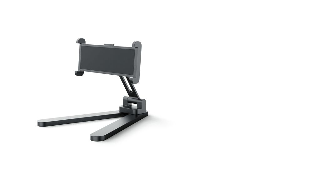 Smooth surfaces and rounded edges characterise this stand in which tablets and smartphones ranging in size from 4.7 to 13" can be clamped. The telescopic mount is pushed into the desired position via a switch, and the angle of inclination can be infinitely adjusted thanks to a damping mechanism. This gives users the freedom to position their device as the situation requires. When the stand is not needed, it can be folded up to save space.
