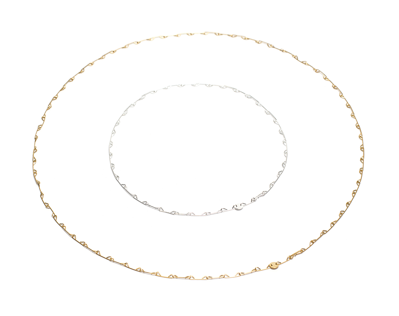 This delicate necklace made of staples is available in lengths of 420 mm and 780 mm. It also comes in three different versions: silver, gold-plated silver as well as rhodium-plated silver anthracite. A closure in the form of a hook makes it possible to adjust the length of the necklace to individual taste so that it can be flexibly adapted to the wearer’s preferences.