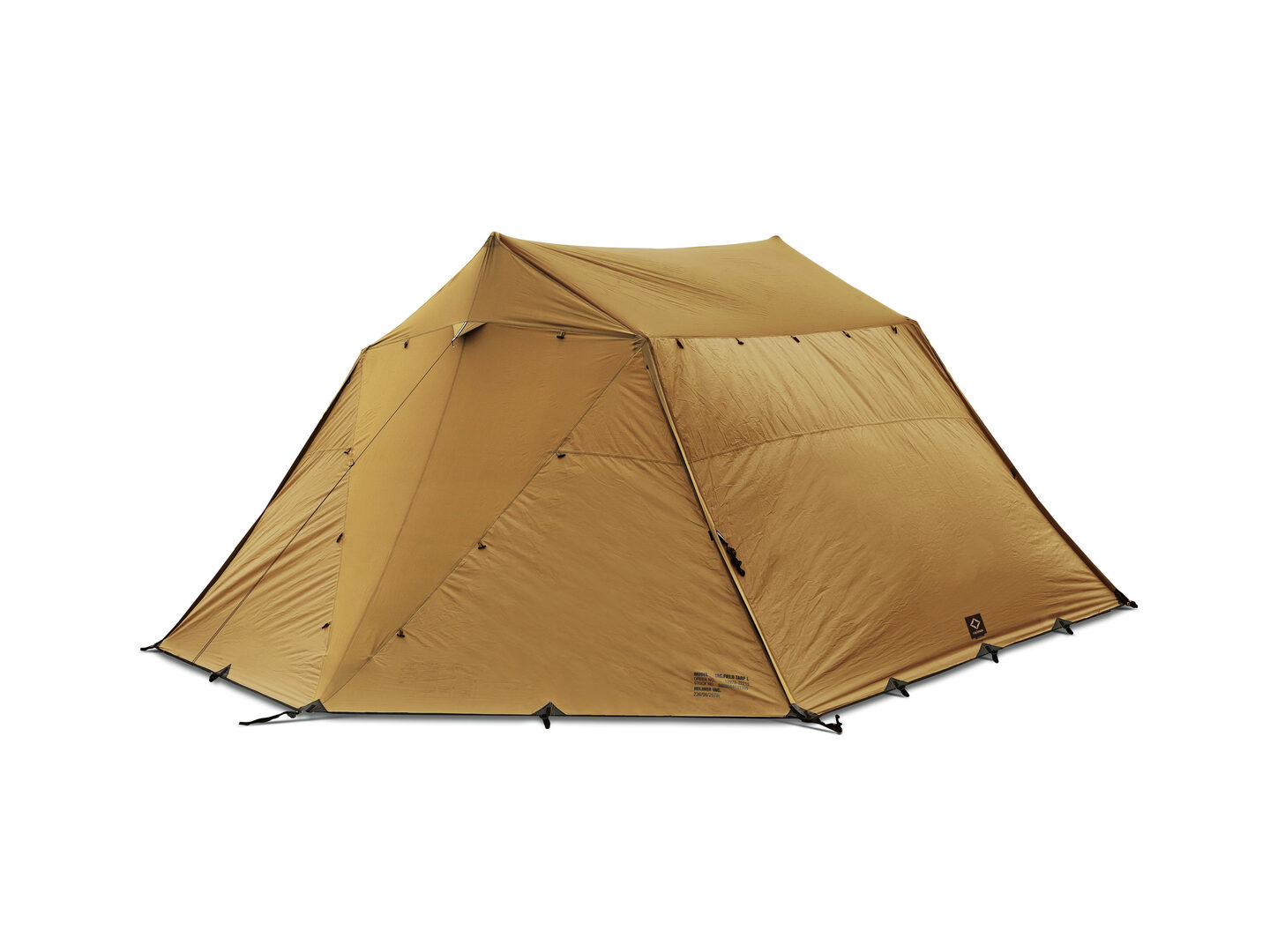 The Tactical Field Tarp L shelter is designed to provide campers flexible accommodation, comfort, protection and ample space. Measuring 6 × 4.5 metres and 2.4 metres in height, the shelter is large enough to accommodate up to ten people. Packed, it weighs only 8.5 kg. The two T-shaped cross structures on each side allow for a wider covered space at full standing height, which increases utility. Eyelets and straps for fixation are easy and quick to install and ensure high stability of the shelter.