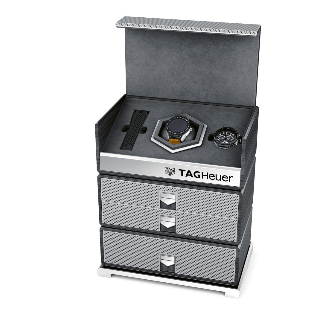 The TAG Heuer Connected Modular 45 Luxury Kit amazes with the variety of options it offers. It allows users to individually switch between a smart watch, a watch module with a modern electronic interior and a high-quality automatic movement with Tourbillon. Furthermore, this kit also integrates various straps that can also be swapped intuitively. At the same time, it showcases a very high quality and a careful implementation of all details. This is a watch whose design is directed into the future.