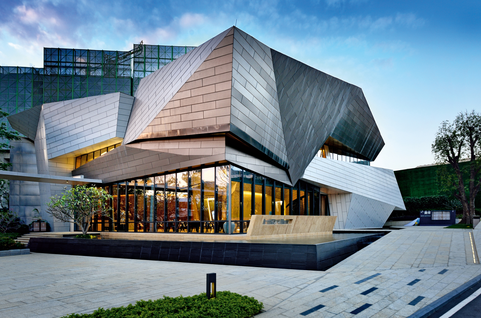 The term “Tai Chi” is a central principle of Chinese culture, which is referenced in the design of this facade. A light and a dark area represent the “Yin” and “Yang” elements of “Tai Chi”. These parts are complementary extremes that together create a unit. At the same time, the architecture was inspired by the aesthetic concept of “Tai Chi” as found in Ju Ming’s sculptures, whose clean lines and particular cutting technique make them very three-dimensional.
