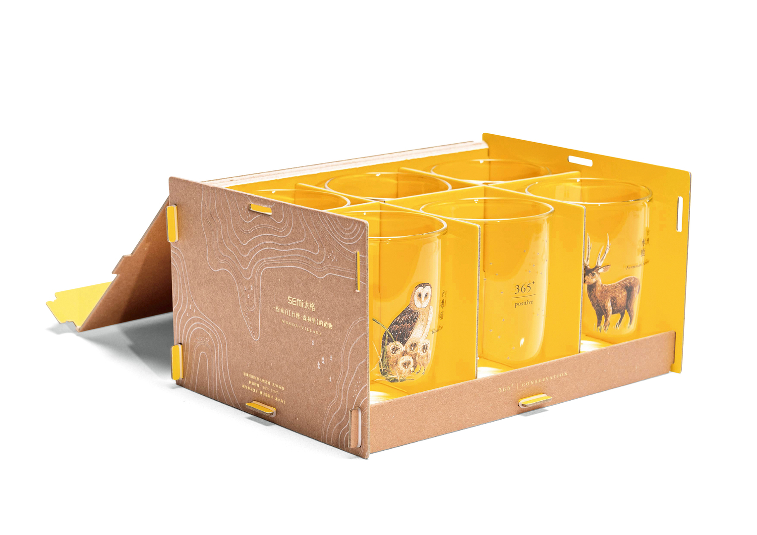 The project “Taiwan endemic species glasses” refers to the biological diversity of Taiwan and its ecological issues. Five classic endemic species have been chosen as the main visual representations. Featuring distinctive “cross marks”, each of the glasses represents the idea of reminding people of thinking positively and being friendly to the environment, for example while drinking with these glasses instead of using disposable cups. The packaging design with its clean, warm layout and map contour lines not only represents a natural living environment so necessary for endemic species, but also communicates feelings of peace, hope and joy.