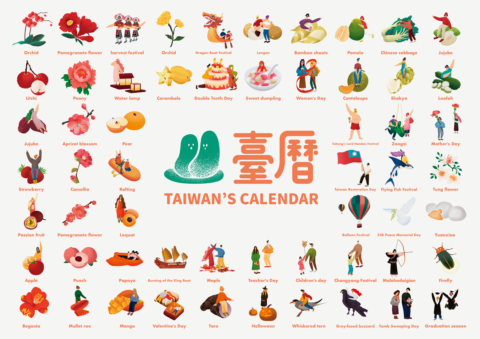 The Taiwanese postcard calendar provides a colourful illustration for every month of the year. The imagery is deliberately simple and presents a clear overview of the key public holidays, festivities and traditions in each month. Varieties of plant, fruit and vegetable serve as symbols for the various blossom and harvest periods. Adults and children working, celebrating or at play merge with typical Taiwanese landscapes to form riotously colourful and vibrant scenes, giving informative insights into the country and its culture.