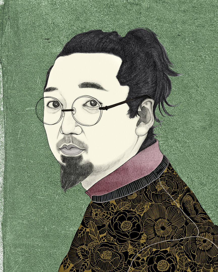 As part of a series of artist portraits, this illustration depicts the Japanese artist Takashi Murakami. Born in 1962, he creates international works of fine art. These vary in painting and sculpture, but also in what is conventionally considered commercial media. This consists of fashion, merchandise and animation. Murakami is known for blurring the line between high and low art. His work has been noted for its use of colour, the incorporation of motifs from Japanese traditional and popular culture, flat / glossy surfaces, and content that could be described simultaneously as cute, psychedelic and satirical.