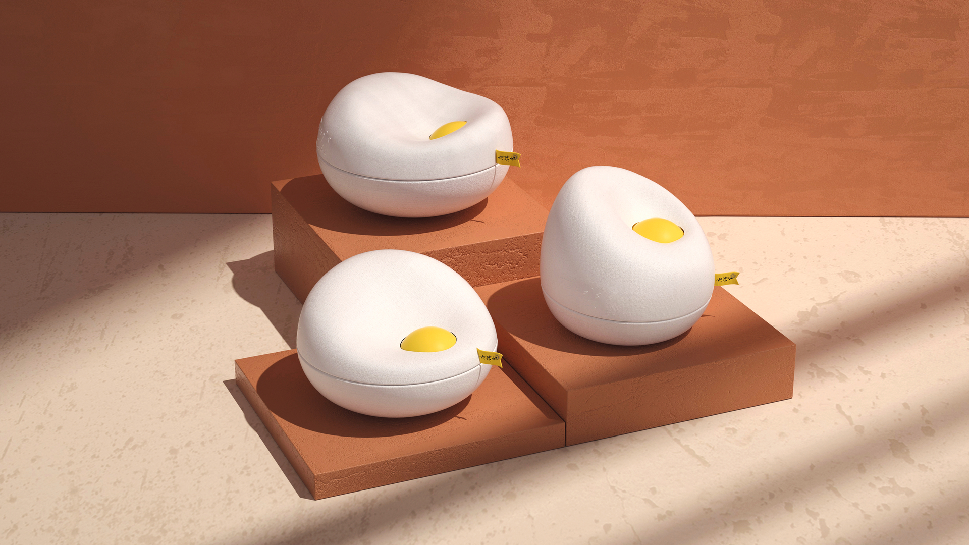 This packaging design imparts to consumers the special ingenuity of Tang’s handmade cake egg-yolk crisps. The shape of the hardcover gift box captures the free form when the dough is kneaded, resulting in many gift boxes with different shapes. The free dough shape expresses the craftsmanship of the confectioner and the process of making egg-yolk crisps. In the structure, the top lid takes the form of a hollow arch, which is simply stuck onto the round inner packaging, with yellow that also symbolises the freshness of the ingredients. As an environmentally friendly concept, the packaging is made from paper moulds pressed with bagasse.