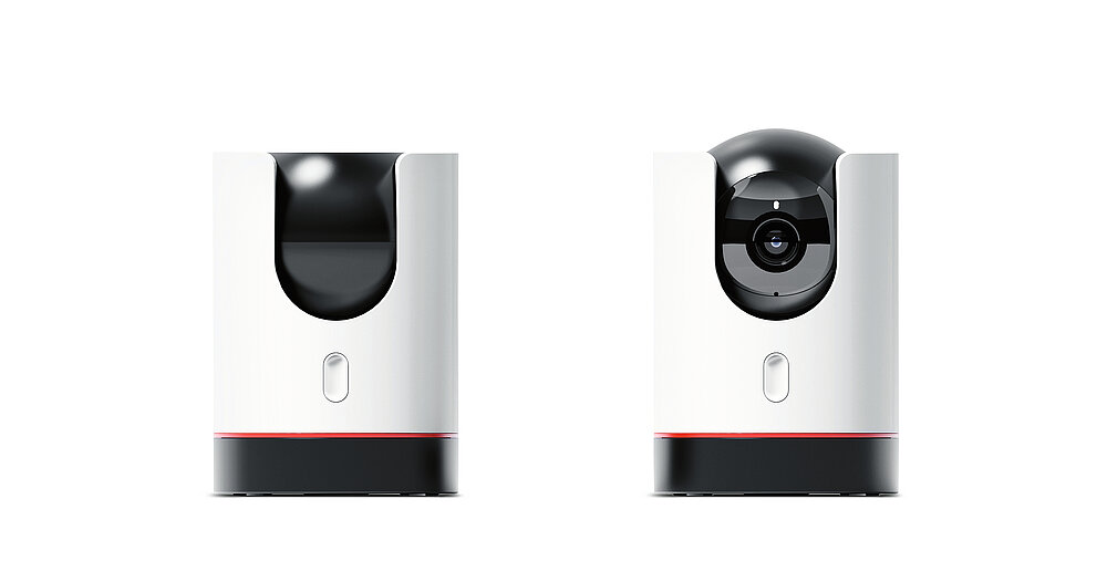 The Tapo C220 is a pan/tilt home camera with 4 MP resolution and artificial intelligence. The spherical camera rotates upward to reveal its lens when alert and rolls downward tucking itself into its body when deactivated. The user can switch between modes simply by pressing the button or using an app. The fine red line at the base reflects its security function while also making a visual statement.