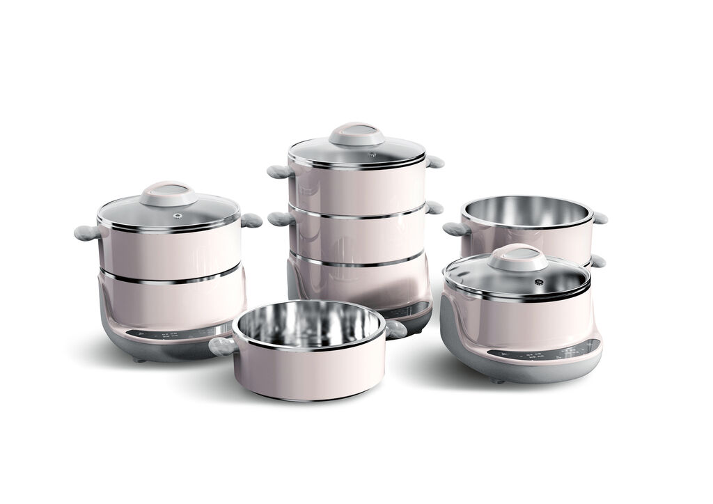 In contrast to a steam cooker with traditional form, this electric food steamer can be used in many different ways. Apart from steaming, it also allows users to prepare dishes like porridge or hotpots, as various cooking methods are available. The form of the steamer, including the base with horizontal operating panel, is rounded; the combination of steel pot and plastic outer shell imparts a distinctive appearance.